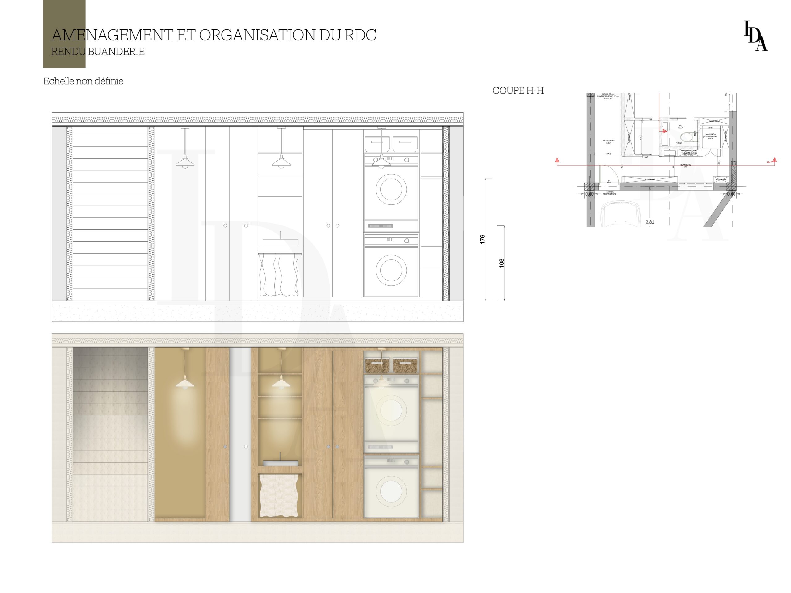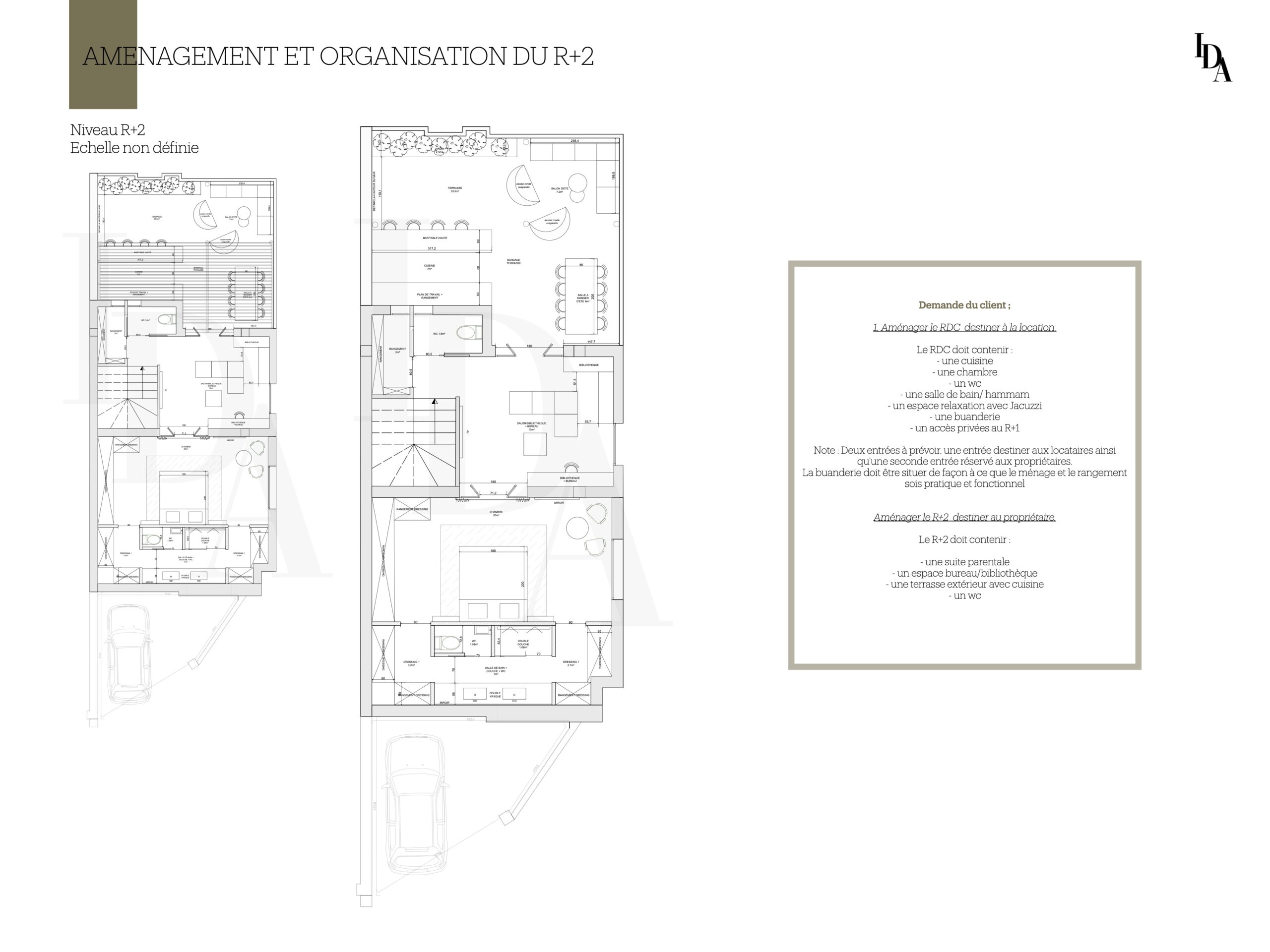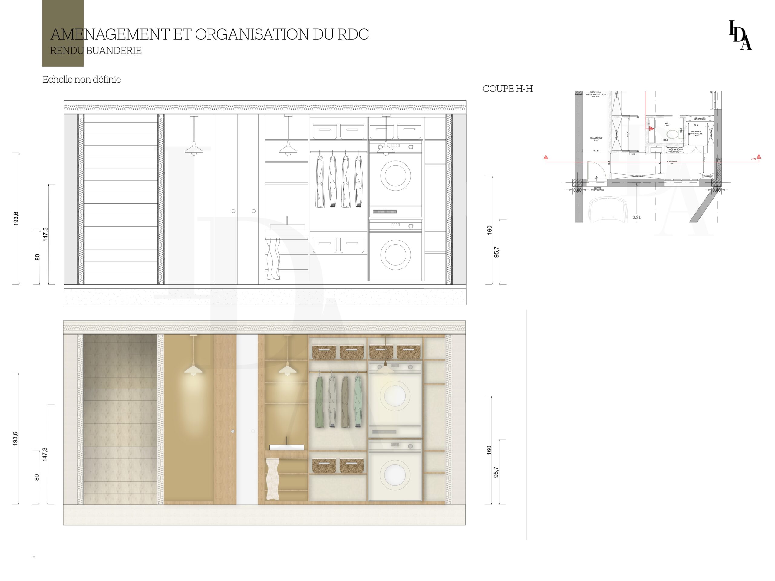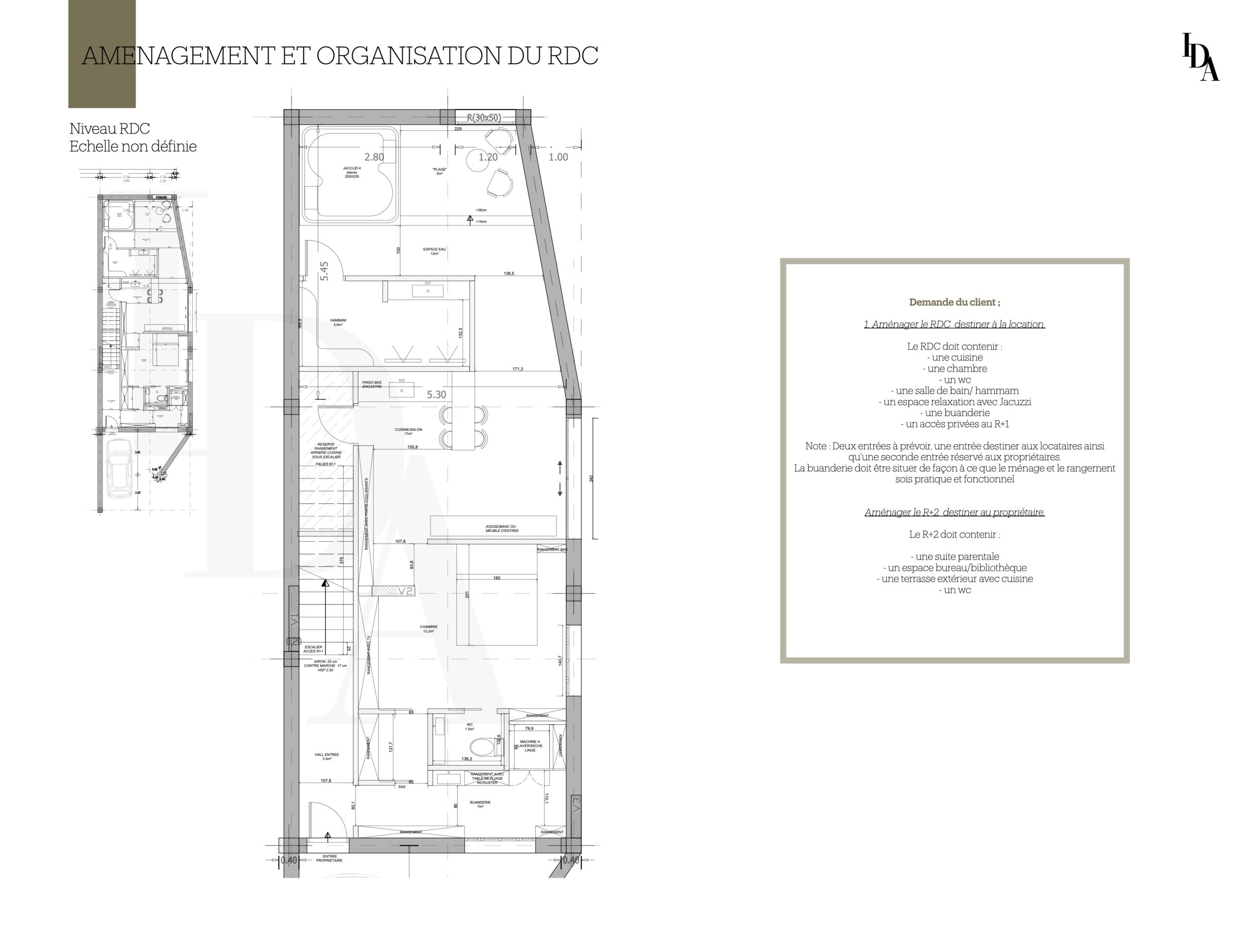 Voici mon travail sur cette maison, dont l’objectif principal était de réaménager l’intérieur avant la phase de construction. La demande du client portait sur l’aménagement du rez-de-chaussée en un espace destiné à la location, tout en intégrant une buanderie facilement accessible.